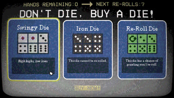 Roll five dice and build poker hands by spending re-rolls if you got 'em, or pray you get lucky. You've got up to four hands to make the target. If you fail, the house collects.